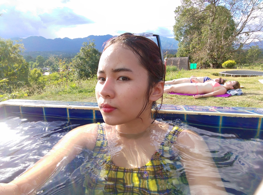 ตอนเดินเข้าไปที่พักจะต้องผ่านสระน้ำ เราชอบว่ายน้ำ มันคือสวรรสำหรับเราเรย บรรยากาศดีมากบอกตรงง