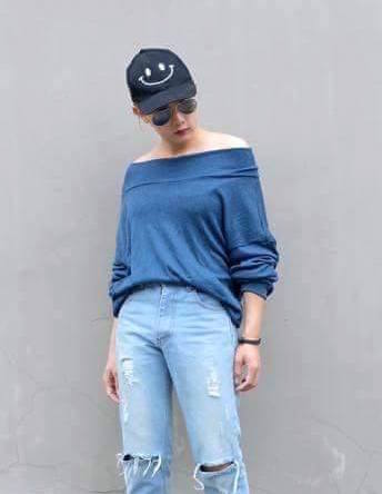 17.รุ่นนี้เป็นผ้ายืดสีฟ้าน้ำทะเลค่ะ ของจริงสีสวยมากก ไม่หนาเลยนะคะ บางๆ ใส่สบายค่ะ รุ่นนี้ตัดมาใส่ได้หลายแบบเลยค่ะ ใส่เป็นคอถ่วงๆ ก็เก๋ แมทช์กับขาสั้นซักตัว หรือใส่ปาดไหล่ก็ดูแพงไปอีกแบบเลยค่ะ แล้วแต่เราจะแมทช์เลย ช่วงล่างจั้มนะคะ แขนก็จั้มค่ะ สีมันสวยมากเลยเน้ออรุ่นนี้ ทรง oversize ไหล่ Free” รอบอก 48” ยาว 27” ราคา 100 บาท (ของใหม่)