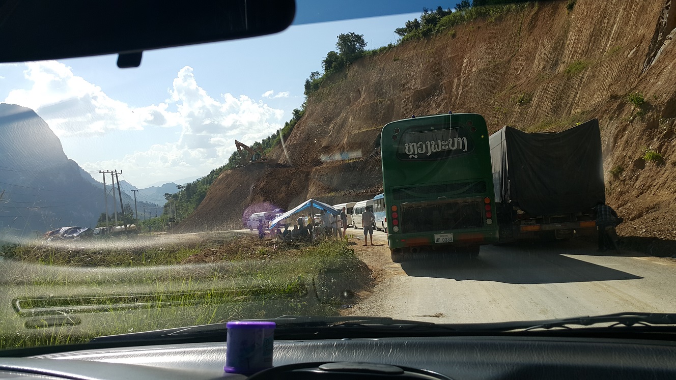 ขับมาสักพักกะลังชื่นชมวิวดีๆก็มาเจอรถจอดเป็นแถวยาว เอ๊ะเกิดไรขึ้น พี่คนขับจอดรถต่อแถว แล้วเดินไปดู สรุปว่ามีการทำทางที่ด้านหน้า มีรถไถดินจากบนเขาลงมาที่ถนน ทำให้รถวิ่งไปไม่ได้ต้องรอจนกว่ารถตักดินจะตักดินออกจากถนนและเปิดทางให้วิ่งได้ พวกเราเสียเวลารอตั้งนานแหน่ะค่ะ ประมาณครึ่งชั่วโมง แต่รถคันที่มาก่อนอยู่หัวแถว ได้ข่าวว่ามารอเป็นชั่วโมงเลยค่ะ พี่ๆดูสิค่ะแถวยาวเชียว