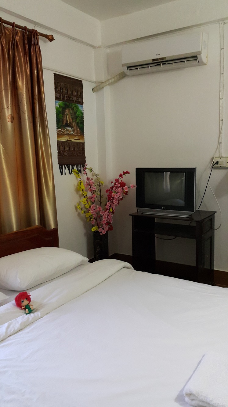กว่าจะเดินทางต่อได้ก้อเสียเวลาพอควร แถมถนนที่จะเข้าวังเวียงเป็นหลุมเป็นบ่อเต็มไปหมด และได้เวลาโรงเรียนเลิกพอดี เด็กขี่จักรยานเป็นแถว แซงกันก็ลำบาก ถนนก็ไม่ดี เลยเสียเวลาไปอีก กว่าจะถึงสถานีก็สี่โมงกว่าละ พอถึงสถานีขนของลงจากหลังคารถได้ พี่ขาวกะเพื่อนก็เรียกรถสี่ล้อเล็กไปส่งที่ๆพัก คนขับเรียกคนละ 50บาท พี่คนขับๆไปได้แป๊ปปปเดียวก็ถึงที่พัก เพื่อนพี่ขาวจองไว้ชื่อ วิลานี 2คืน 30เหรียญ อืออก็อไม่แพงเนอะ สภาพห้องก็ดีนะค่ะ ไปดูกันเลยค่ะ ในห้องมีทอทัดให้ด้วย แต่ไม่เคยเปิดดูเลยค่ะ5555