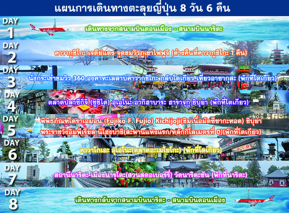 เราวางแผนการเดินทางเกือบปีหลังจากที่ได้จองโปรตั๋วที่นั่งของหางแดงบินตรงจากสนามบินดอนเมือง มายังสนามบินนาริตะ ได้ช่วงกลางๆเดือนกุมภาพันธ์ 2558 ระยะเวลารวม 8 วัน 6 คืน โดยใช้เที่ยวบิน XJ 600 เครื่องออกเวลา 23.45 น. ก่อนการเดินทางเราได้สำรวจพื้นที่จาก Google Map รวมทั้งไปงานที่จัดเกี่ยวกับการท่องเที่ยวญี่ปุ่น ไม่ว่าจะเป็นงานไทยเที่ยวไทย ไปเที่ยวโลก งานเที่ยวญี่ปุ่นด้วยตัวเอง พวกเราไปมาหมด เก็บสะสมแผนที่และใช้โอกาสสอบถามเส้นทางที่น่าสนใจรวมทั้ง Pass ต่างๆที่ใช้ในการเดินทางให้คุ้มค่าที่สุด เพราะเราตั้งเป้าหมายว่าไปเก็บที่สำคัญให้ครบและต้องใช้เงินให้คุ้มค่าที่สุด เราเลยค่อนข้างจะละเอียดเกี่ยวกับการเดินทางไปยังสถานที่ต่างๆ ค้นหา Pass ต่างๆที่เหมาะกับการเดินทางของพวกเรา
