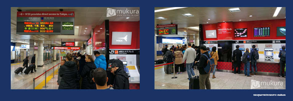 เดินจากจุดซื้อตั๋วรถไฟ Tokyo Subway มาทางด้านขวา เดินลงบันไดเลื่อนมา ให้เลี้ยวซ้ายตรงไปเรื่อยๆ สังเกตทางขวามือจะเห็นเคาเตอร์ขายตั๋วอยู่ 2 ฝั่ง สังเกตสีของเคาเตอร์ก็ได้จะมีสีฟ้ากับสีแดง ให้มาทางสีแดง Keisei -JR East travel service center สังเกตสัญลักษณ์ของ N'EX