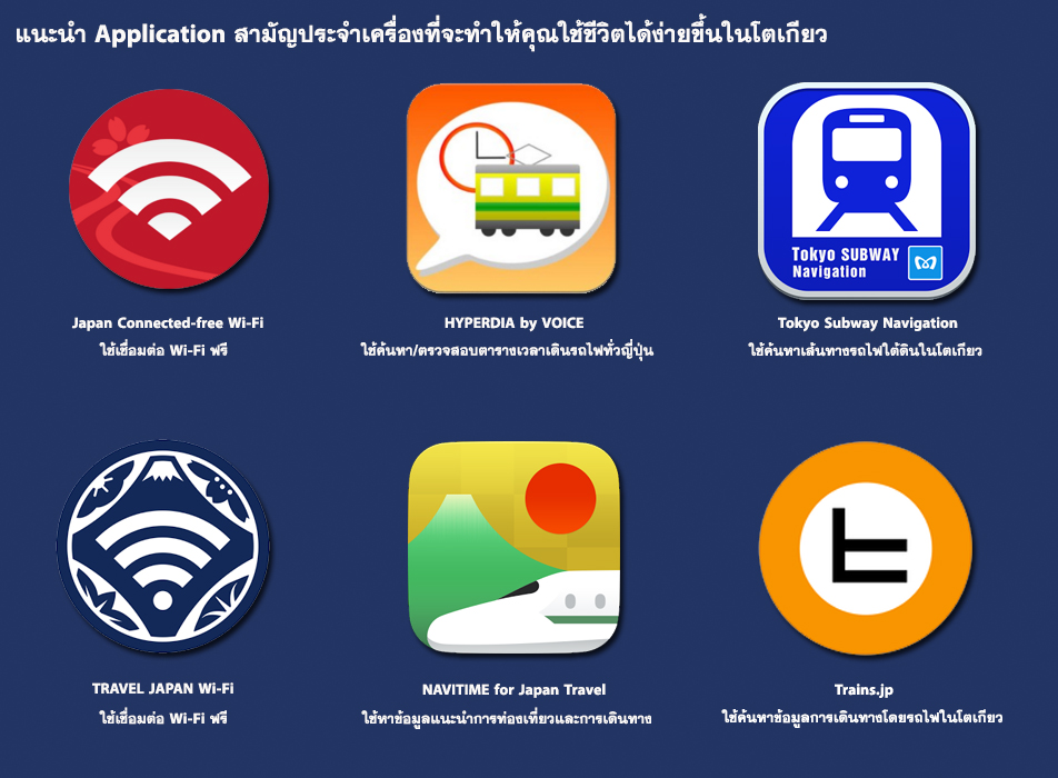 แอพที่แนะนำให้โหลดเก็บไว้เพื่อเชื่อมต่อสัญญาณกับอินเตอรเน็ตที่ญี่ปุ่นก็จะมี Japan Connected-free Wi-Fi!กับ TRAVEL JAPAN Wi-Fi หลักๆที่ใช้ แล้วก็ยังมีแอพเสริมอื่นๆที่ช่วยในการเดินทาง เช่น Hyperdia by VOICE ,Tokyo Subway Navigation , Trains.jp, NAVITIME for Japan Travel เป็นต้น ก็ลองเลือกดูว่าแอพไหนที่หน้าจะเป็นประโยชน์กับเราก็ลองโหลดไว้ไม่เสียหาย