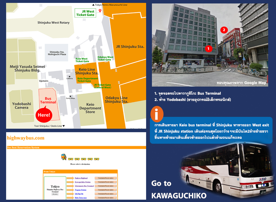 มาต่อกัน เมื่อถึงสถานีชินจูกุแล้วก็จะต้องเดินตามหาจุดจอดรถบัสที่ไปคาวากูชิโกะซึ่งเป็น รถบัสของบริษัท Keio Bus ให้บริการจากสถานี Keio Highway Bus Terminal (สถานีอยู่ตรงข้ามห้าง Yodobashi) ที่ย่านชินจุกุ รถจะวิ่งตรงมาลงปลายทางที่สถานี Kawaguchiko ใช้เวลาประมาณ 2 ชั่วโมง ค่าโดยสาร 1,700 ¥/เที่ยว รถออกทุกครึ่งชั่วโมง (ซื้อตั๋วไป-กลับ 3,400 ¥/คน) อันนี้บอกอีกอย่างคือให้สำรองที่นั่งมาล่วงหน้า เพราะเท่าที่ดูหน้างานหรือหน้าเคาเตอร์คนเยอะมาก อาจไม่เพียงพอถ้าจะไปจองที่นั่น โชคดีที่เราทำการศึกษามาดีเลยจองผ่านเว็บไซต์