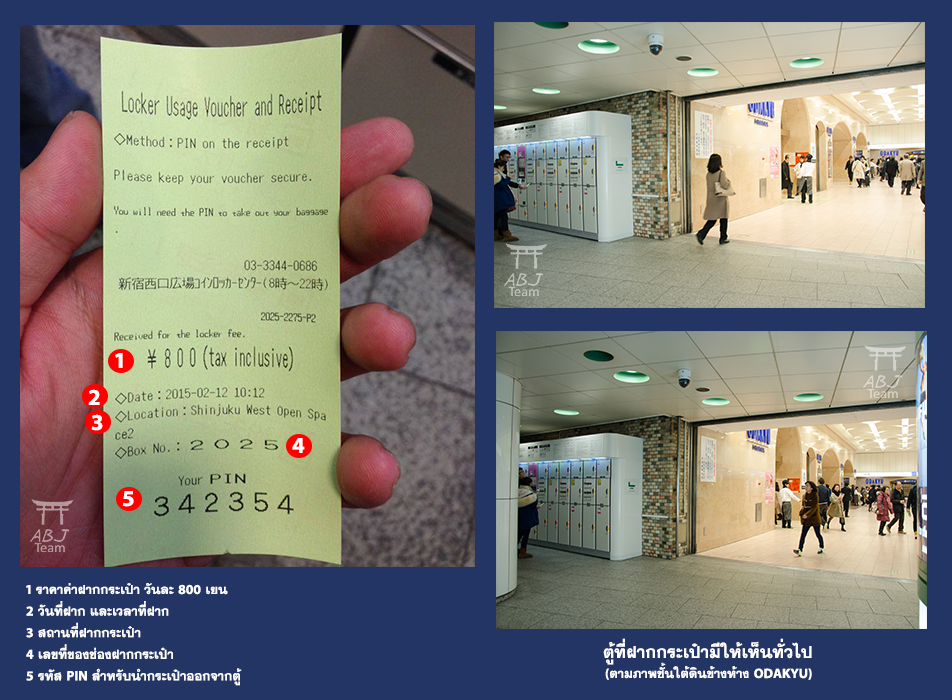 พอดีว่าเรามีกระเป๋าลากใบใหญ่ 2 ใบ จะเอาไปคาวากูชิโกะด้วยก็ดูจะลำบาก เราก็เลยหาตู้ฝากกระเป๋า อยู่บริเวณในสถานีรถไฟชินจูกุเลย หาไม่ยาก เป็นตู้ฝากกระเป๋าหยอดเหรียญ มีหลายราคาขึ้นอยู่กับขนาดไซส์กระเป๋า พอดีกระเป๋าของพวกเราสามารถยัดเข้าได้ทั้งสองใบ ช่องใหญ่สุด ตกอยู่ที่วันละ 600 เยน คิดเป็นวัน เราจะกลับมาเอากระเป๋าพรุ่งนี้ก็เสีย 2 วัน 1200 เยน ก็คุ้มนะกับการที่ไม่ต้องแบกกระเป๋าพะรุงพะรัง เอาเฉพาะเสื้อผ้าของใช้จำเป็นใส่เป้เล็กไป สบายๆ เดินตัวปลิว ที่ตู้เป็นแบบให้ตั๋วพร้อมรหัสเปิด เมื่อใดมาเปิดก็ต้องใส่รหัสใส่เงินตามจำนวนเงินคิดตามวันที่ฝากกระเป๋าง่ายๆเลย