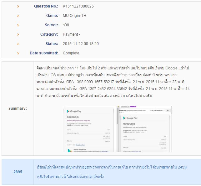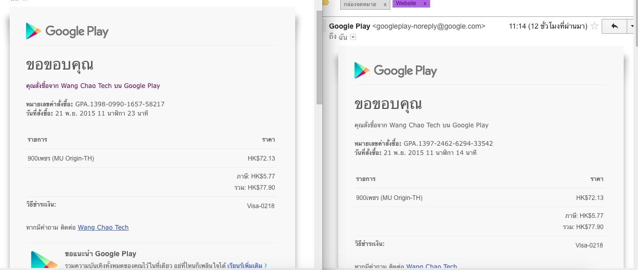 เรื่องของเรื่องคือผมเติมเกมส์ MU Origin ช่วงเวลา 11 โมง ของวันที่ 21 พ.ย. 2015 2 ครั้ง