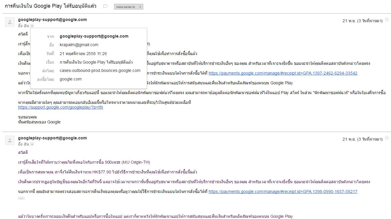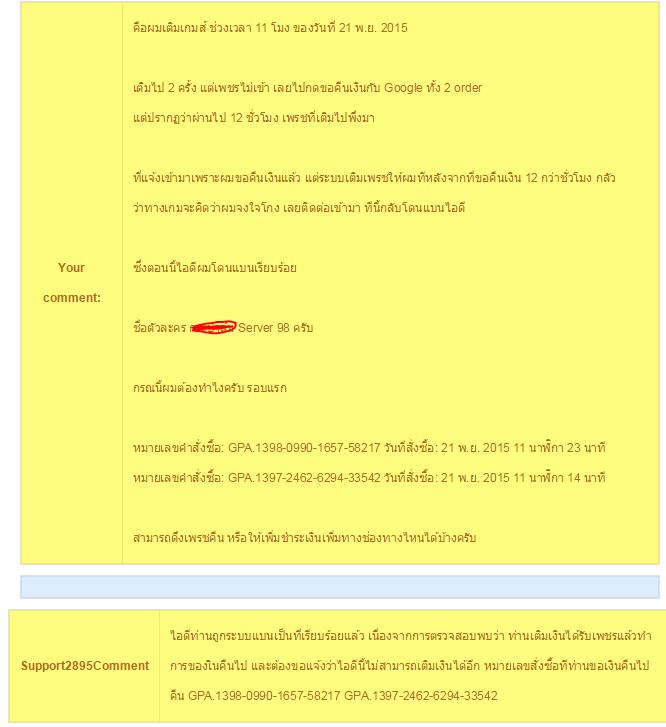 เติมไป 2 ครั้ง แต่เพชรไม่เข้า เลยไปกดขอคืนเงินกับ Google ทั้ง 2 order ซึ่ง Google ก็คืนเงินให้ทันที ผมก็ไม่ได้คิดอะไรมาก เพราะเติมแล้วไม่ได้ของก็ขอคืนเงิน และไปล็อคอินเกมส์ที่ iPhone แล้วเติมผ่าน App Store แทน แต่ปรากฏว่าผ่านไป 12 ชั่วโมง เพรชที่เติมไปพึ่งมา