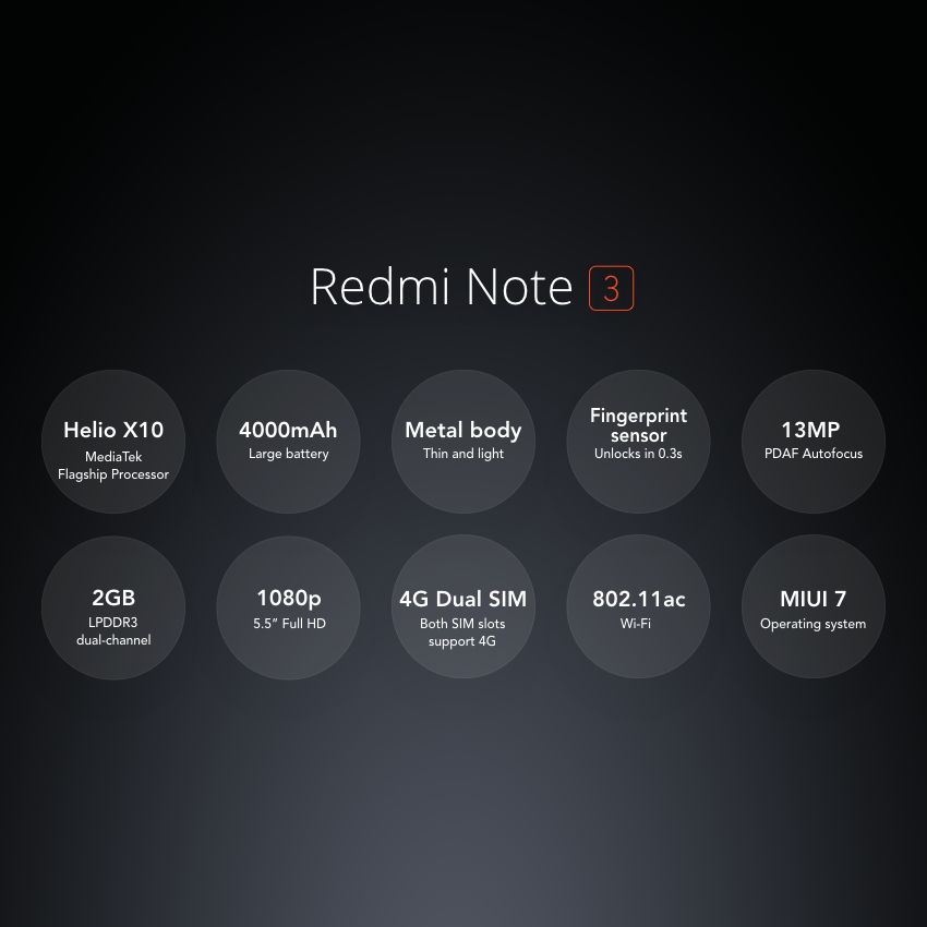 Xiaomi Redmi Note 3 มาพร้อมขุมพลัง MediaTek Helio X10 รองรับ 4G LTE สนับสนุน 2 ซิมการ์ด มีให้เลือก 2 เวอร์ชั่น คือ RAM 2 GB + ROM 16 GB ราคา 899 หยวน (ประมาณ 5,040 บาท) และเวอร์ชั่น RAM 3 GB + ROM 32 GB ราคา 1,099 หยวน (ประมาณ 6,161 บาท)