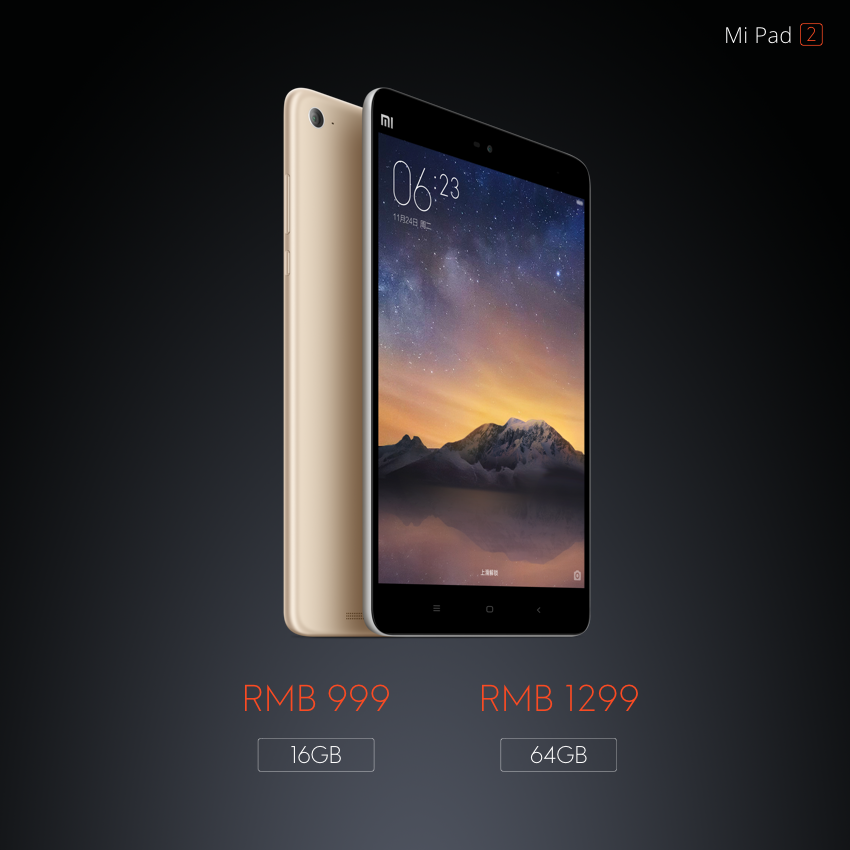 Xiaomi Mi Pad 2 ดีไซน์บางเฉียบ 6.95 มิลลิเมตร มาพร้อมขุมพลัง Intel Atom X5-Z8500 64-bit 2.24 GHz Quad Core หน่วยความจำ RAM 2 GB จอแสดงผลระดับเดียวกับ iPad mini 4 กว้าง 7.9 นิ้ว ความละเอียด 2048 x 1536 พิกเซล (326 ppi) กล้องด้านหลัง 8 ล้านพิกเซล กล้องด้านหน้า 5 ล้านพิกเซล ความจุแบตเตอรี่ 6190 mAh พร้อมใช้งานนานสูงสุด 648.8 ชั่วโมง ฟังเพลงนานต่อเนื่อง 100 ชั่วโมง เชื่อมต่ออินเตอร์เน็ตผ่าน Wi-Fi 802.11ac และ รองรับการเชื่อมต่อ USB Type-C