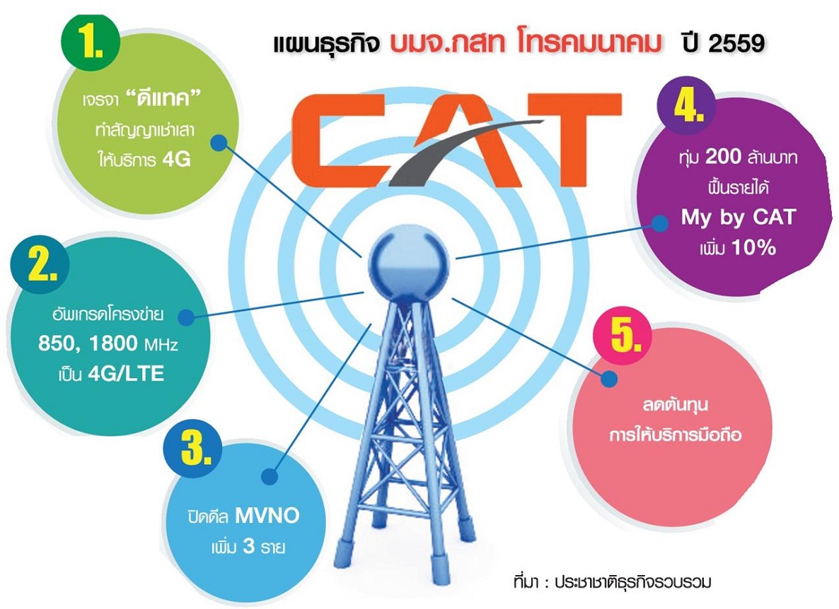 และในปี 2559 จะมีรายได้จากธุรกิจไร้สาย 24,800 ล้านบาท ตั้งเป้ามีรายได้จากการขายส่งความจุให้ MVNO รายใหม่ เพิ่มขึ้น 400 ล้านบาท หลังคู่สัญญา MVNO 2 รายคือ บมจ.สามารถ ไอ-โมบาย และบริษัท ดาต้า ซีดีเอ็มเอ คอมมูนิเคชั่น จำกัดจะเริ่มเปิดให้บริการ ธ.ค.นี้