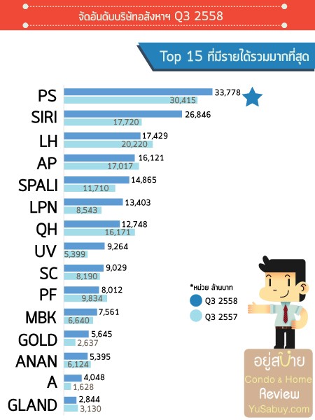วันนี้อยู่สบายได้รวบรวมข้อมูลงบการเงินของบริษัทพัฒนาอสังหาริมทรัพย์ ที่เกี่ยวข้องกับบ้านและคอนโด จากทั้งหมด 33 บริษัทที่ประกาศงบการเงินช่วงไตรมาส 3 ของปี 2558 นี้ออกมาให้มาดูกันแล้วว่าบริษัทไหนได้กำไรเยอะแค่ไหน และมีรายได้รวมมากที่สุดตลอด 9 เดือนที่ผ่านมาในปีนี้เท่าไหร่ โดยทางอยู่สบายจะแบ่งข้อมูลออกเป็น 3 หมวดค่ะ เริ่มจากรายได้รวมของแต่ละบริษัทที่มีรายได้สูง 15 อันดับแรก โดยจะเทียบกับช่วงไตรมาส 3 ของปี 2557 ด้วย ต่อไปจะเป็นอันดับบริษัทที่มีกำไรสุทธิมากที่สุด และอันดับบริษัทที่มีอัตรากำไรสุทธิสูงสุด 15 อันดับแรก ส่วนข้อมูลที่เป็นตัวเลข Fact Sheet จะอยู่ท้ายสุดของบทความค่ะ