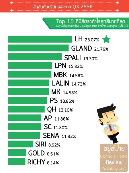 โดยบริษัทที่มีกำไรสุทธิมากที่สุดตลอด 9 เดือนในปี 2558 ที่ผ่านมา คือ บริษัท พฤกษา เรียลเอสเตท จำกัด (มหาชน) (PS) ทำกำไรสุทธิไปได้ 4,686 ล้านบาท อันดับสองตามมาติดๆคือ บริษัท แลนด์ แอนด์ เฮ้าส์ จำกัด (มหาชน)(LH) ที่ทำกำไรได้ 4,609 ล้าบาท ห่างกันแค่ 80 ล้านบาท อันดับสามคือ บริษัท ศุภาลัย จำกัด (มหาชน) (SPALI) ที่ทำกำไรไป 3,069 ล้านบาท อันดับสี่ได้แก่ บริษัท แสนสิริ จำกัด (มหาชน)(SIRI) ที่ได้กำไร 2,503 ล้านบาท และอันดับที่ห้าคือ บริษัท แอล.พี.เอ็น.ดีเวลลอปเมนท์ จำกัด (มหาชน)(LPN) เข้ามาติดอันดับแซงหน้า AP โดยได้กำไรสุทธิไป 2,125 ล้านบาทค่ะ