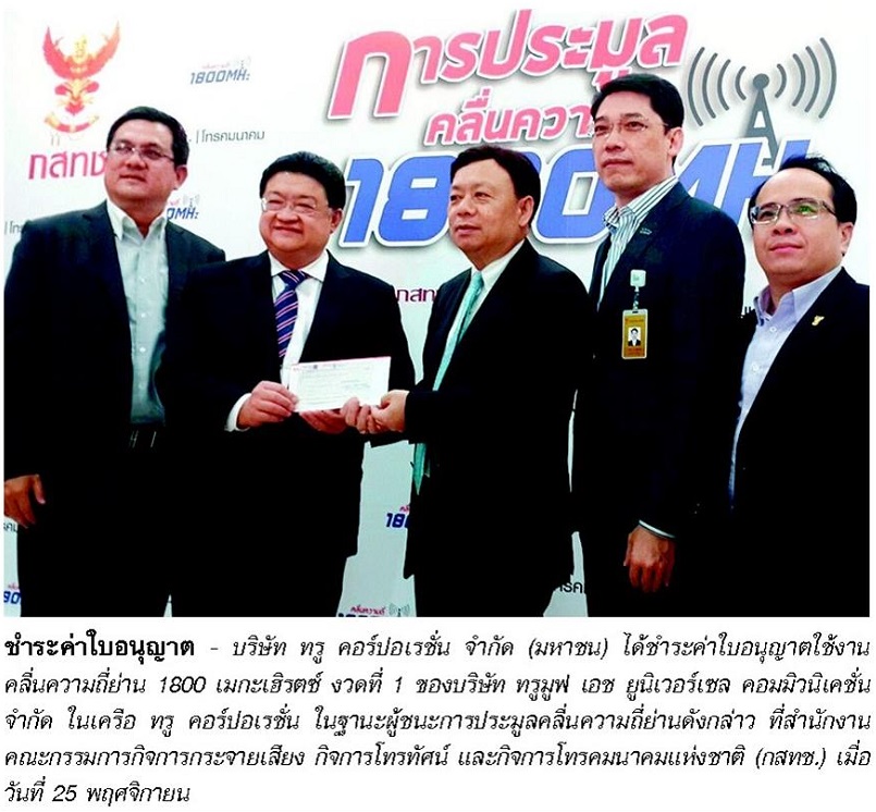ผู้สื่อข่าวรายงานว่า เวลา 15.50 น. นายธิติฏฐ์ นันทพัฒน์สิริ ผู้อำนวยการบริหารด้านรัฐกิจสัมพันธ์ บริษัท ทรู คอร์ปอเรชั่น จำกัด (มหาชน) ได้เดินทางไปชำระค่าใบอนุญาตใช้งานคลื่นความถี่ย่าน 1800 เมกะเฮิรตซ์ งวดที่ 1 ในฐานะผู้ชนะการประมูล จำนวน 50% ของเงินที่ชนะการประมูล 39,792 ล้านบาท (ยังไม่รวมภาษีมูลค่าเพิ่ม 7%) โดยใช้แคชเชียร์เช็คเงินสดของธนาคารไทยพาณิชย์มูลค่า 20,492.72 ล้านบาท (รวมภาษีมูลค่าเพิ่ม)