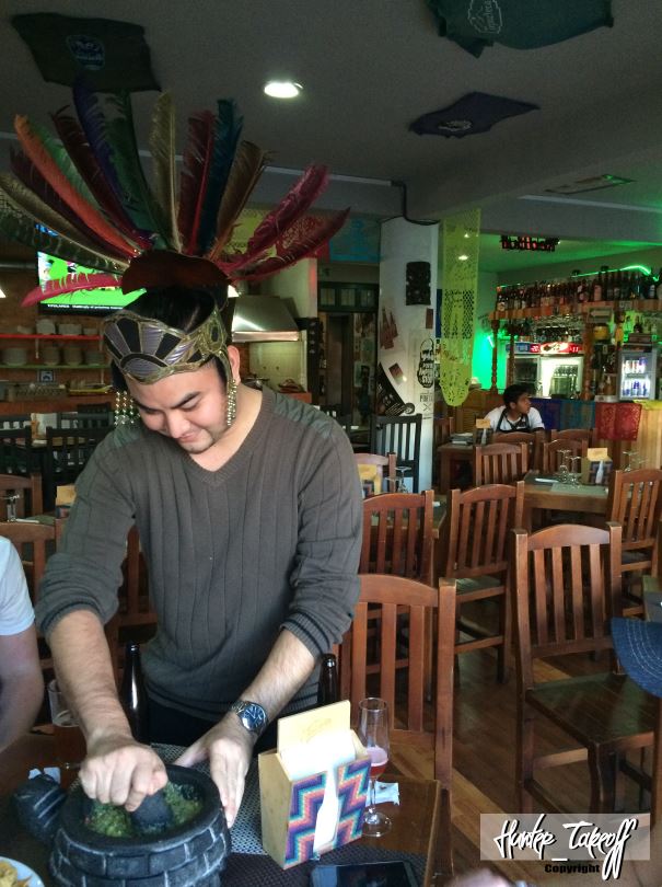 Salsa en molcajete " มันเป็นธรรมเนียมที่ต้องใส่ขนนกบนหัว เห็นเจ้าของร้านบอกมานะ