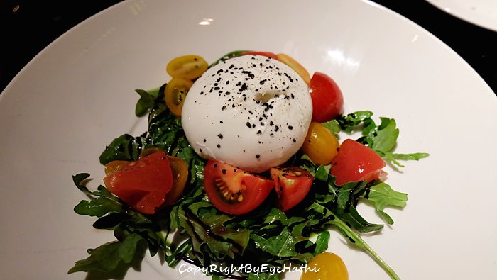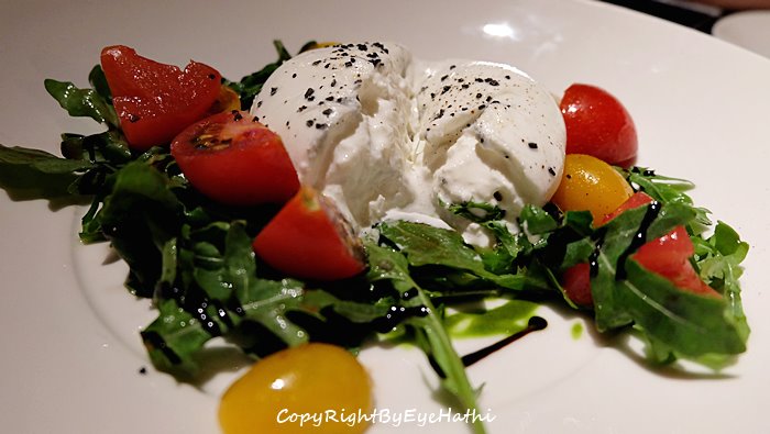 บูราตะ ที่นี่เปลือกบางแต่แข็งหน่อยค่ะ ส่วนเนื้อด้านในครีมดี รสจะออกมันๆ ครีมๆหน่อย กินกับสลัดเพลินๆดี