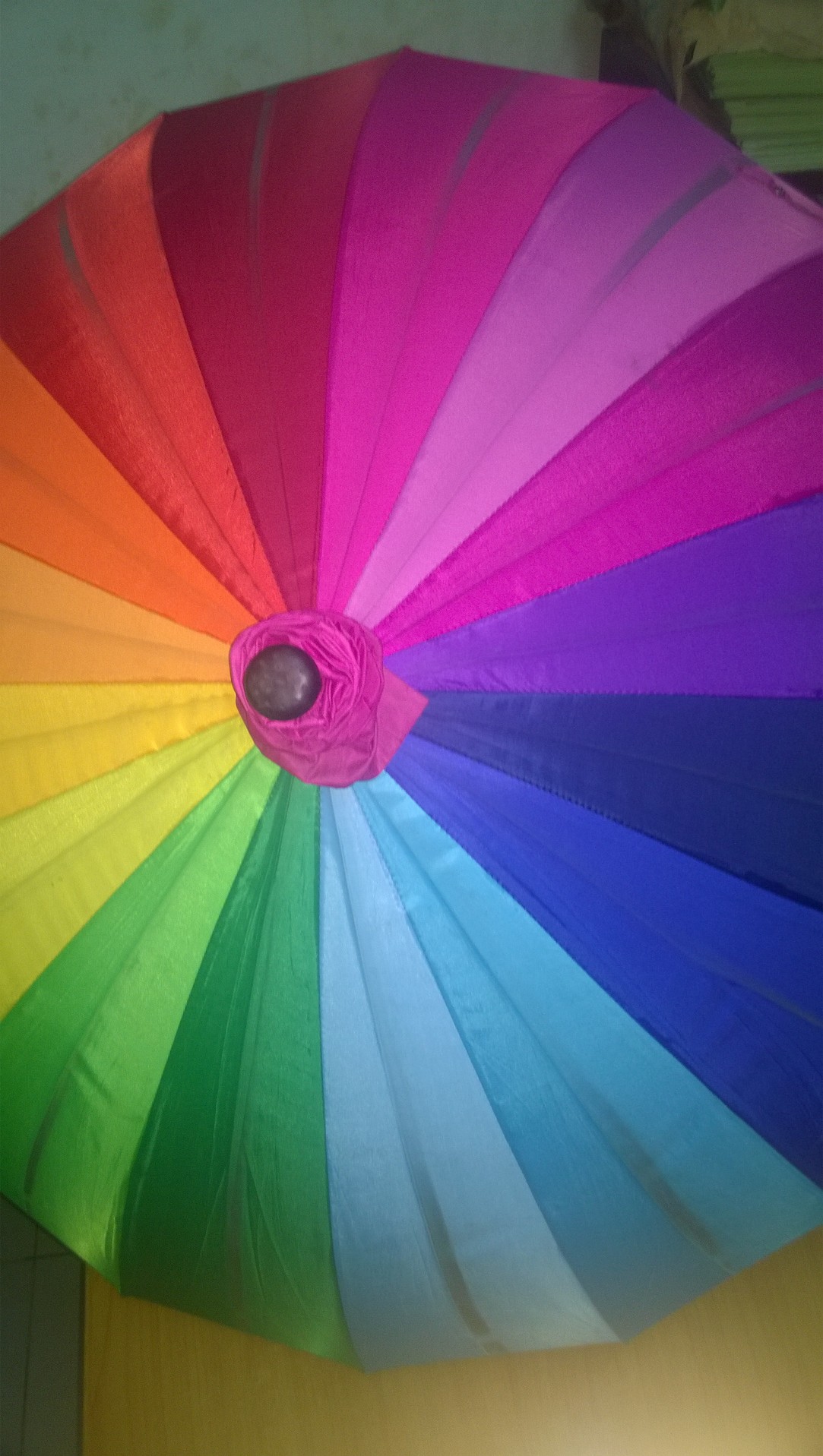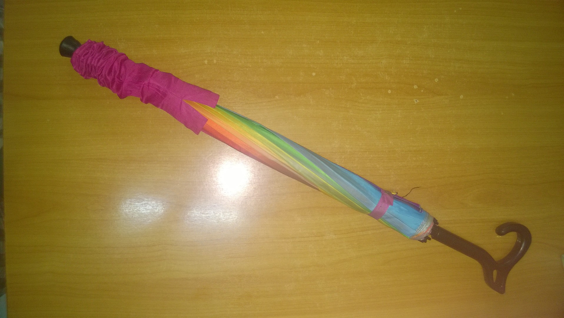 เป็นร่มแบบยาว ร่มหลากสีเป็นสีรุ้ง ปลอกร่มเป็นสีส้ม (จึงเห็นร่มเป็นสีส้มมากกว่า) ด้ามร่มเป็นสีดำ รูปทรงจับมือไม่เป็นแบบรูปโค้ง
