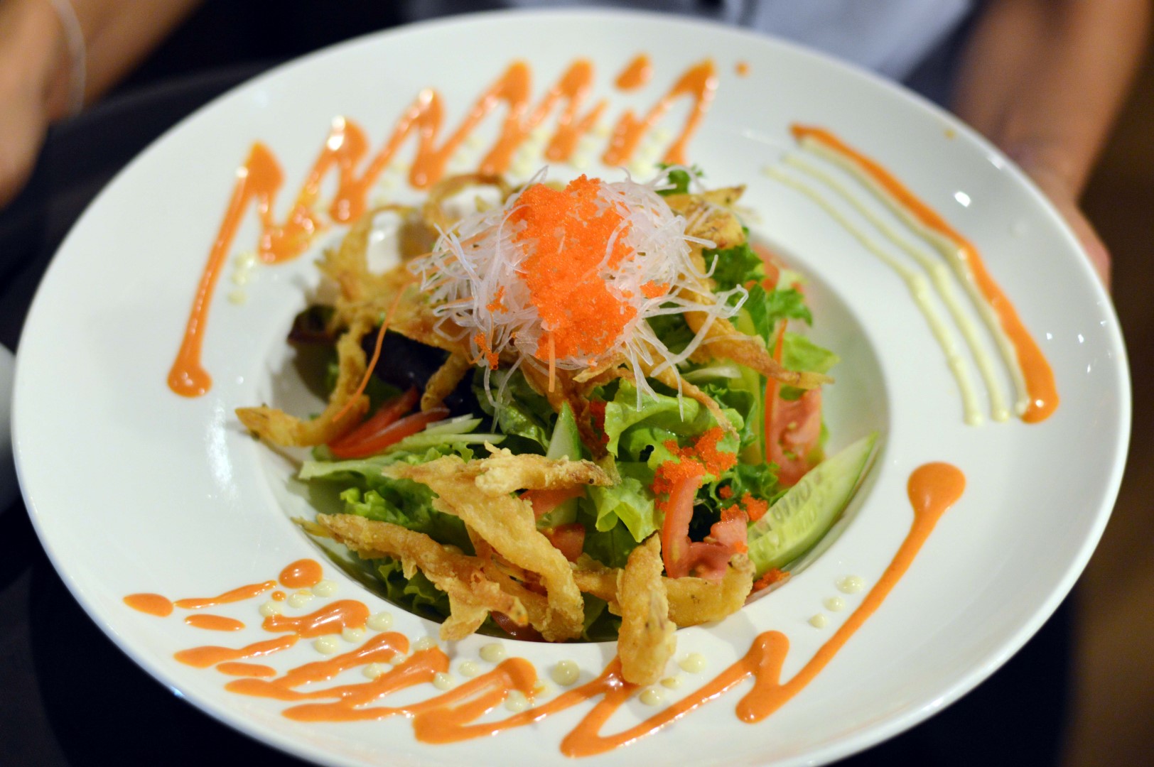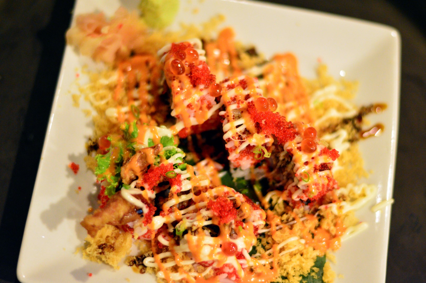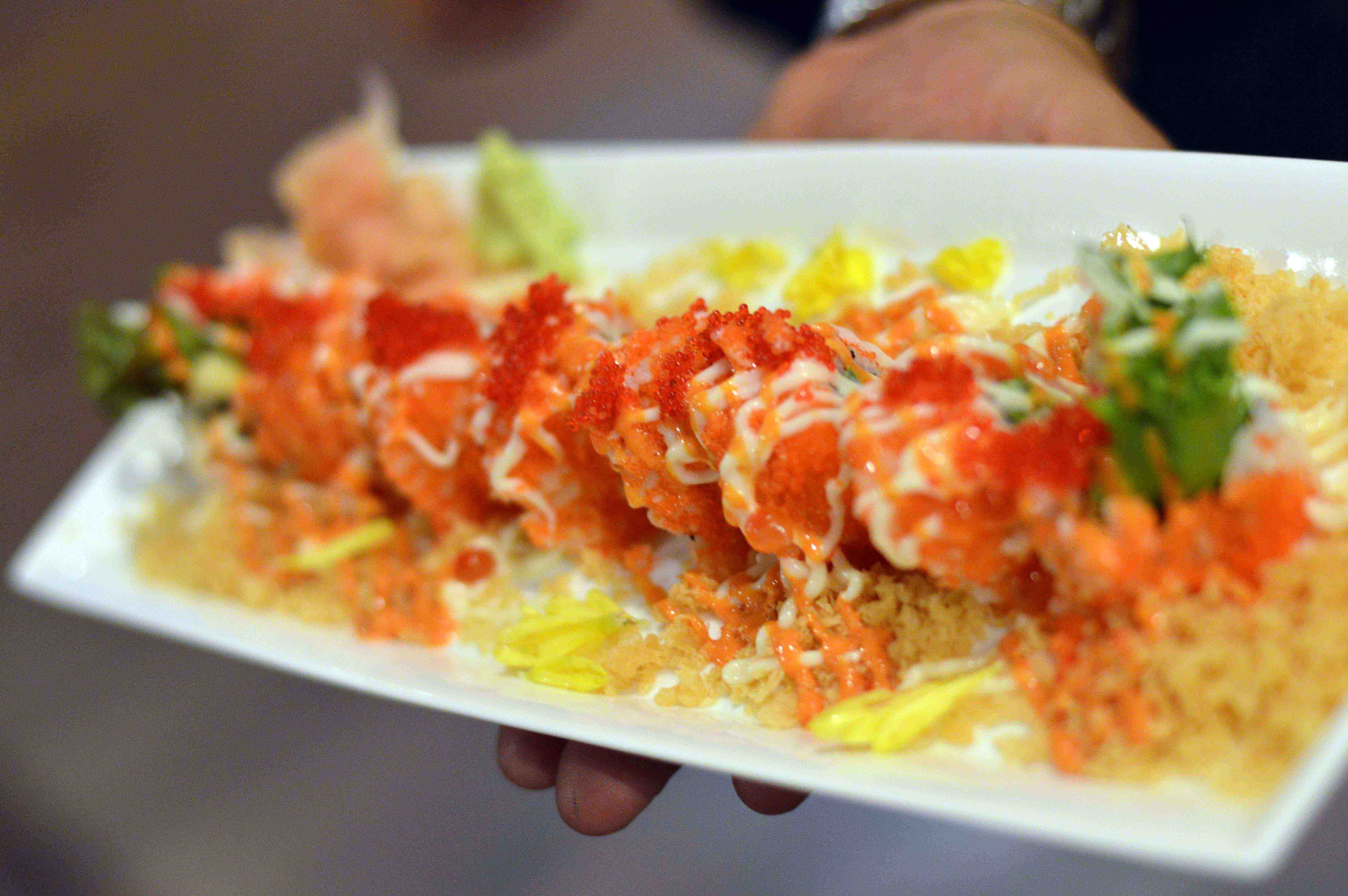 ให้ความรู้สึกเวลาทานกับเนื้อปลาเข้ากันได้ดี ในจานยังมีไข่กุ้งและไข่ปลา โปะหน้ามาให้ด้วย