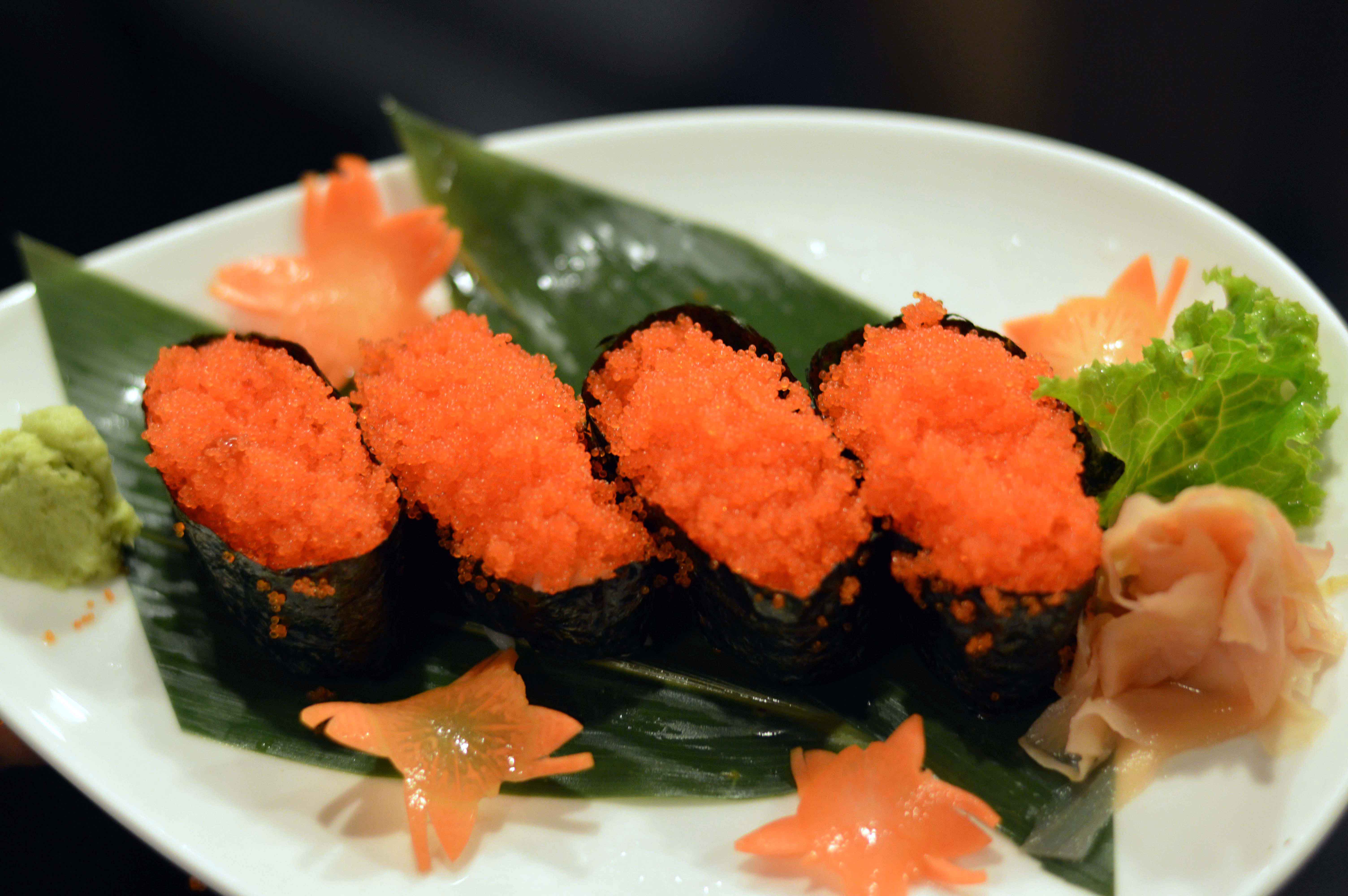 ส่วนออร์เดอร์ที่มาพร้อมกับจานสลัดคือ ซูชิหน้าไข่กุ้ง ซึ่งพี่เค้ายัดไข่กุ้งมาเต็มมากกกก อันนี้คือแบบต่อชิ้น ใหญ่กว่าปากพอสมควร สาวๆกินต้องผ่าครึ่ง