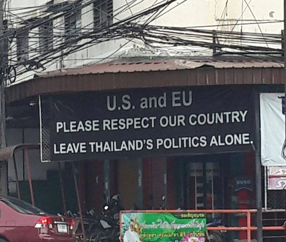ในมุมสะท้อนกลับ การขึ้นป้ายเช่นนี้กลับจะเป็นผลเสียต่อภาพลักษณ์ของแหล่งท่องเที่ยวนั้นๆ และรวมถึงประเทศไทยด้วย ป้ายบอกว่าให้ Respect คือเคารพประเทศไทย(ด้วยการที่ อียูและยูเอสไม่เข้ามายุ่งทางการเมืองของไทย) นักท่องเที่ยวส่วนใหญ่ที่มาประเทศไทยนั้น “ให้” มากกว่าการเคารพเสียอีกนะครับในสายตาผม สำหรับนักท่องเที่ยวหลายๆ คนนั้นมองข้ามเรื่อง “เคารพ” ไปได้เลย เพราะบางคน “รัก” บางคน “หลง” ประเทศไทยด้วยซ้ำ ฝรั่งที่ผมรู้จักบางคนเข้ามาเที่ยวประเทศไทยปีละหลายๆ ครั้งๆ ก็มี หรือถ้าจะว่าไปแล้ว...ยังมีประเทศอีกมากมายทั่วโลกที่เขาจะบินไปเที่ยวพักผ่อนได้ แต่เขาเลือกที่จะมาประเทศไทยแม้จะมีวิกฤติทางการเมืองในตอนนี้ก็ตาม แล้วท่านเจ้าของป้ายล่ะครับ? เคารพคนอื่นมากน้อยแค่ไหน? ไม่ต้องเคารพคนอื่นคนไกลอย่างนักท่องเที่ยวก็ได้ครับ อย่างน้อยๆ ก็เคารพคนไทยหรือคนในพื้นที่ที่ทำธุรกิจด้านการท่องเที่ยวหรือแม้แต่ธุรกิจเล็กๆ ที่คอนตะกร้าขายของที่ระลึกให้กับนักท่องเที่ยวตามริมฟุตบาทก็ยังดี ว่าการขึ้นป้ายบนความสะใจของตัวเองแค่นี้มันส่งผลกระทบในวงกว้างขนาดไหน??