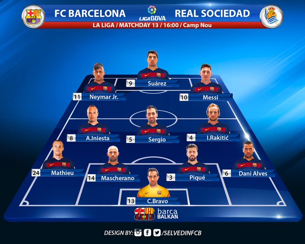 Line-up : Valdes - Alves Pique Mascherano Adriano - Xavi Busquets Iniesta - Alexis Messi Neymar สวัสดีฮับ พัก 2 วันจากนัดที่ 5 หนุ่มๆ ก็ต้องเตะนัดที่ 6 ซะแล้ว วันนี้เจอกับทีมที่ยื่นความพ่ายแพ้ให้บา