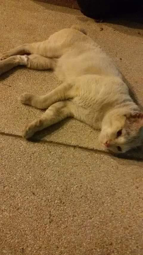 เค้าเป็นแมวจรจัดที่อยู่ใต้หอ คาดว่าน่าจะเป็นของนักศึกษาในหอนำมาปล่อยทิ้งไว้ เราเอาอาหารให้เค้ากินเป็นประจำ หลังจากนั้นเราก็ไม่เห็นเค้าเกือบอาทิตย์ เมื่อวานมาเจอเหมือนเค้าจะโดนกัด แต่เราไม่แน่ใจว่าโดนห