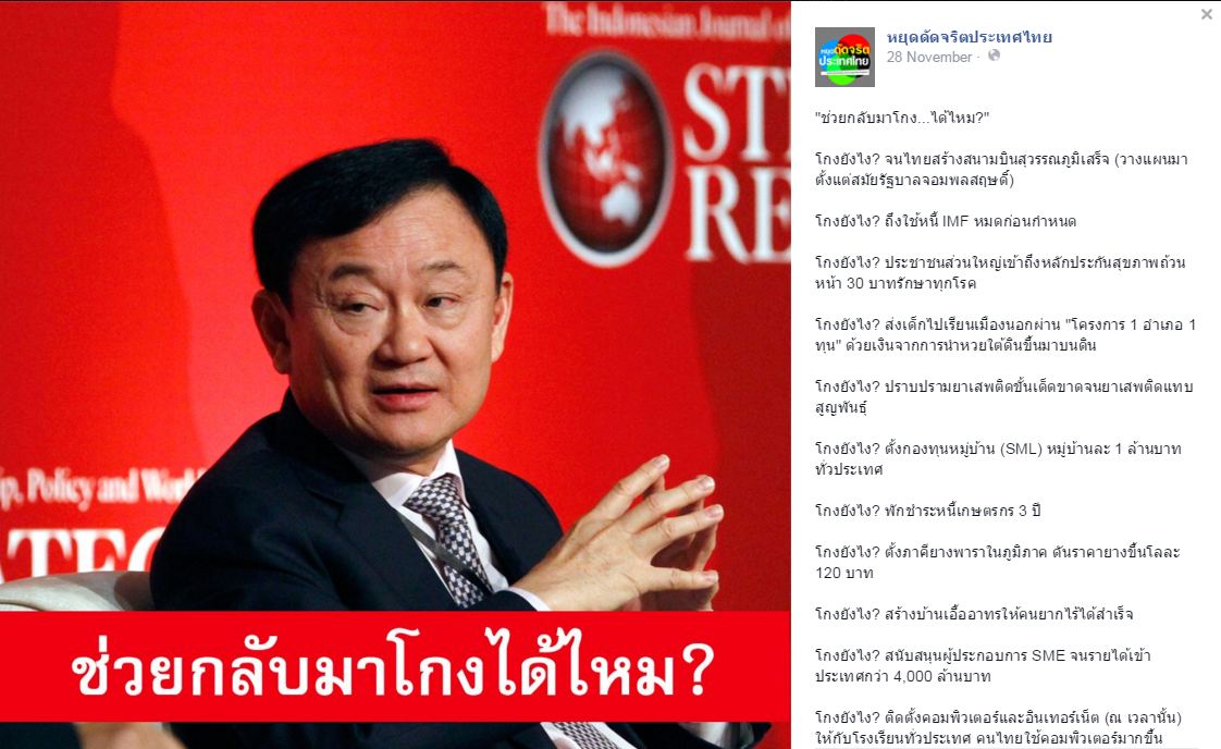 ถ้าคนหลายคน(อ้างอิงจากในเพจ) บอกว่า ถ้าโกงแล้วประเทศไทยเจริญ ก็ขอให้เขากลับมาโกงอีกครั้งเถอะ!