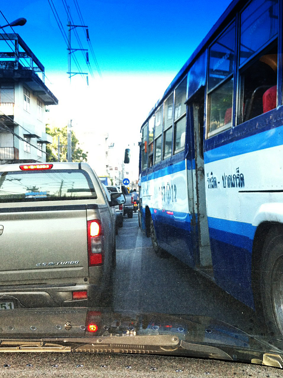 รูปที่2 รถเมล์ แบบนี้มาทุกวัน ไม่มึนแต่ถือว่าเป็นสิทธิที่ถูกต้อง รูดขวาชิดเกาะกลางมาเลย พอมาเบี่ยงเข้าทำให้ท้ายรถไปบังเลนที่จะตรงลงลอดอุโมงค์ซะด้วย