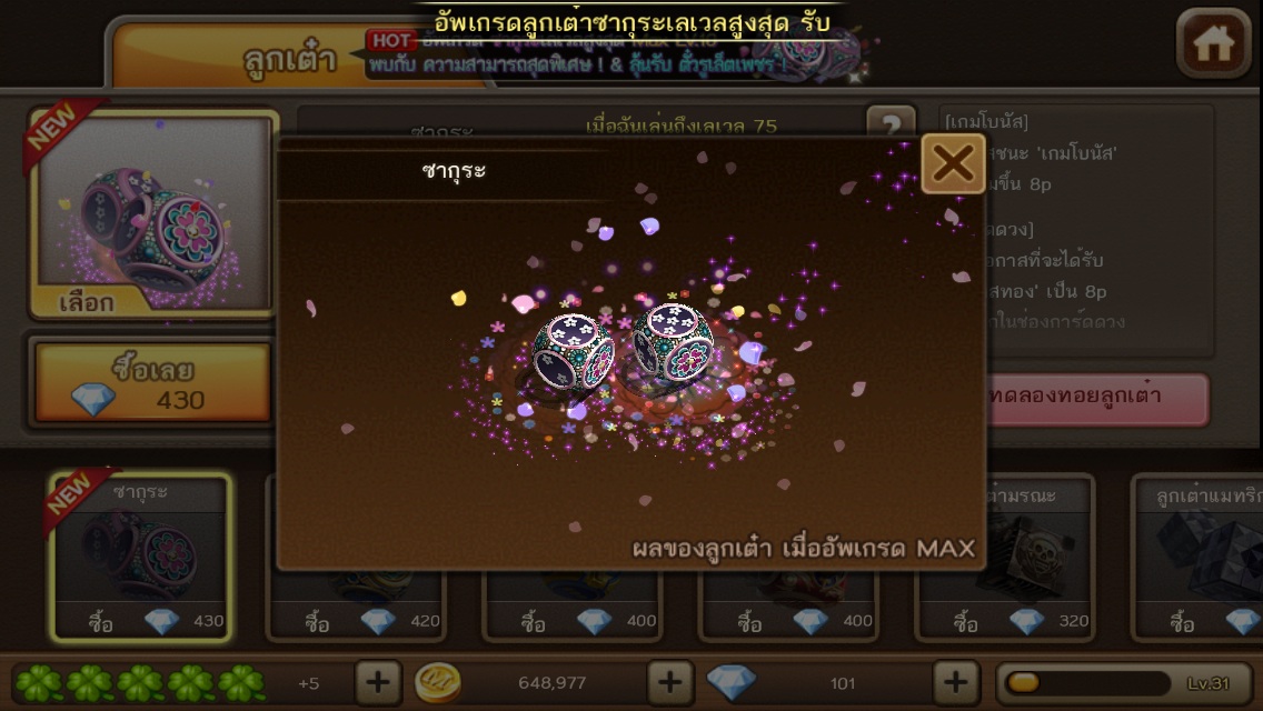 รู้สึกชอบมากๆๆๆ ขนาดยังไม่อัพทอยแม่นมาก (มาใหม่ก็อย่างนี้) พอทอยเต๋าเสร็จใบซากุระจะปลิวรกตามาก555 เสริม* เบิ้ลบ่อยครับเต๋านี้