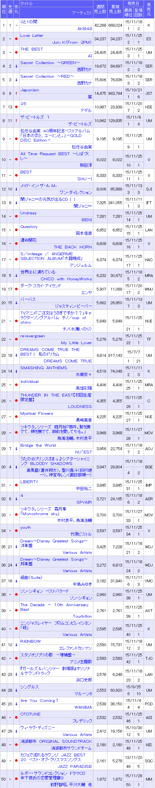 วง AKB48 ฉลองครบรอบ 10 ปีกับการวางขายอัลบั้มที่ 7 『0と1の間』 ในสัปดาห์ที่ 2 ขายได้อีก 42,268 แผ่น รวมเป็น 668,024 แผ่น คงที่อันดับ 1 ของโอริคอนชาร์ทอัลบั้มรายสัปดาห์ 2 สัปดาห์ติดต่อกันครั้งที่สอง หลังจากก่อนหน้านี้กับอัลบั้ม "1830m" (2012) ในรอบ 3 ปี 2 เดือน