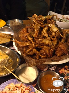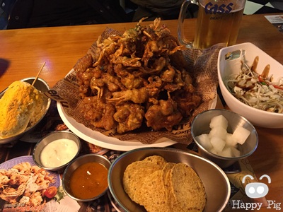 พนักงานบอกว่า Soy นี่ฮิตมาก คนชอบสั่ง รสชาติจะหวานๆ ... หวานกว่า Sweet อีก!!! หืมมมม ???? แต่ก้เลิกสงสัยละสั่งเลยละกัน จัดรสฮิต Soy Baby Crab Chicken ไป ..... ระหว่างรอก้มากิน กินกับแกล้มกันก่อนเลย มี Taco กับ Dipping Sauce แล้วก้มี ข้าวโพดคลุกผงชีส (ออกรสหวานทุกอย่าง) ถึงเวลาที่ปูน้อยกลอยใจมาเสิร์ฟ คืออร่อยอ่า แต่หวานนะ คือคนไม่ชอบหวานบายจานนี้ไปได้เลย ของทอดเกาหลีแต่ละร้านนี่ค่อนข้างจัดว่าดีมาก คือไม่อมน้ำมันเลย จานนี้มาจานใหญ่มาก แต่ก้กินเหลือแต่ไก่ไม่กี่ชิ้น *** ถ้าจะมากิน อยากแนะนำให้สั่ง Sweet น่าจะดีกว่า เพราะเห็นของคนอื่นตอนกินเสร็จ Sweet น่าจะเลี่ยนน้อยกว่าเพราะว่าคง Spicy เบาๆ แต่จานนี้ชอบมาก ถ้าได้กลับไปเที่ยวก้คงไม่พลาดอีกแน่ มันเพลินๆ ยื่งถ้าไปกันหลายๆคน ใครกินเบียร์คงจิบกันมันส์น่าดู