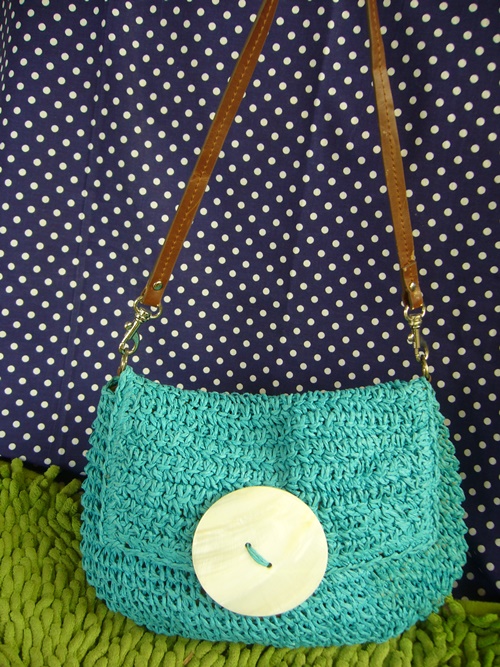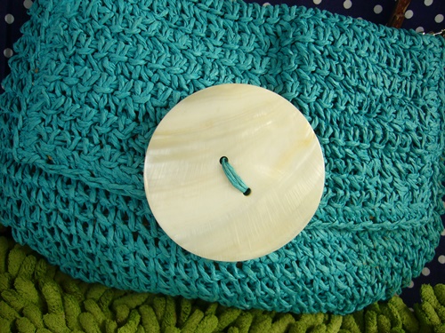 ::ใบที่3 กระเป๋าถักสีฟ้า น่ารักมาก กระดุมเปลือกห้อยดานหน้าอันใหญ่ สายหูหิ้วถอดออกเป็นกระเป๋าถือได้