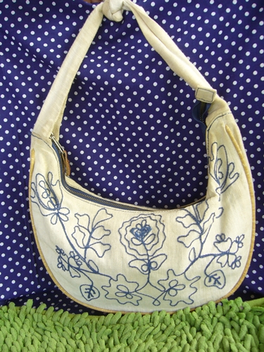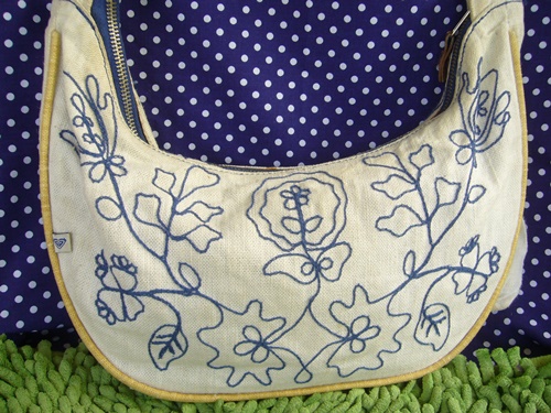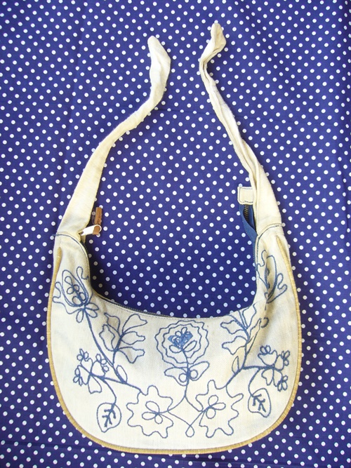 ::ใบที่4 กระเป๋าผ้าดิบ ปักลายดอกสีฟ้า ยี่ห้อRoxy หูกระเป๋าเป็นแบบผูก สามารถมัดปรับระดับได้ ข้างเป็นผ้ายีนส์ค่ะ