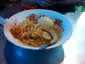 มันคือ ขนมจีนใส่น้ำกะทิโปะหยวกล้วยใส่ไข่เต็มใบ 1 ฟอง พยายามสื่อสารว่า ราคาเท่าไหร่ๆ ฮาวมัชๆ สรุป ได้ไข่มาอีกฟอง