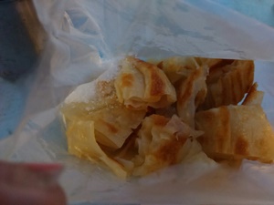 ล้างปากกันด้วย ขนมโตเกียวเวอชั่นพม่า แป้งเค้าจะเหมือนขนมโตกียวบ้านเรา แต่ เค้าตีไข่ 1 ฟอง น้ำตาลสามช้อน มะพร้าวขูด และถั่ว เราบอกแม่ค้าว่าไม่เอาถั่วนะคะ แม่ค้าพยักหน้าและ โรยถั่วววววว อย่างทั่วถึง เอ้า จัดมา!!! สรุป อร่อยค่ะ แต่หวานมาก หวานจนต้องร้องขอยาฉีดคุมน้ำตาลเลยทีเดียว อันนี้ราคา 200 จ๊าด ประมาณ 6 บาทไทย