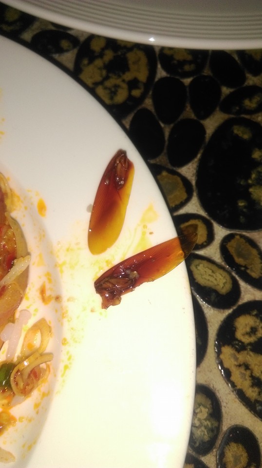 จานแรกมาเสริฟ์ น่าตาไม่ต่างจากในเมนู คุณค่ะ กินไปได้สองคำก็เจอบางอย่าง บางอย่างที่ไม่ใช่วัตถุดิบในการปรุงอาหาร ในใจภาวนาไม่ให้เป็นเป็นที่ดิฉันคิด แต่พอพิจารณาอย่างถีถ้วน มันใช่แน่ๆ มันคือปีกแมลงสาบ เลยสกิดผช.ให้ช่วยดูเพื่อยืนยันว่ามันใช่ ปรากฏวาเจออีกปีกนึงในจานเขาค่ะ น้ำตาเริ่มคลอเบ้า อ้วกแทบพุ้งตรงนั้น ฝ่ายผช.ก็ถือจานข้าวไปให้พ่อครัว ระหว่างนั้นดิฉันก็อ้วกสิ่งที่กินเข้าไปออก บังเอิญที่ห้องน้ำมันอยุ่ติดกับห้องครัว เลยได้ยินทุกอย่างที่บรรดาพ่อครัวแม่ครัวคุย คุณคะ แมลงสาบทั้งตัวอยู่ในพริกเผา ดิฉันเข้าใจว่าสีมันกลืนกันเลยแยกไม่ออก ว่าอันไหนพริกเผาอันไหนปีกแมลงสาบ ทางร้านพยายามจะเปลี่ยนอาหารให้ใหม่ แต่ใครจะกินลง นาทีนั้นทางร้านเองก็รับผิดชอบโดยการโดยที่ทางเราไม่ต้องเสียค่าใช้จ่ายใดในส่วนของเครื่องดื่ม หมูผัดกะปิที่อยากกินจึงอวสานไปโดยสิ้นเชิง