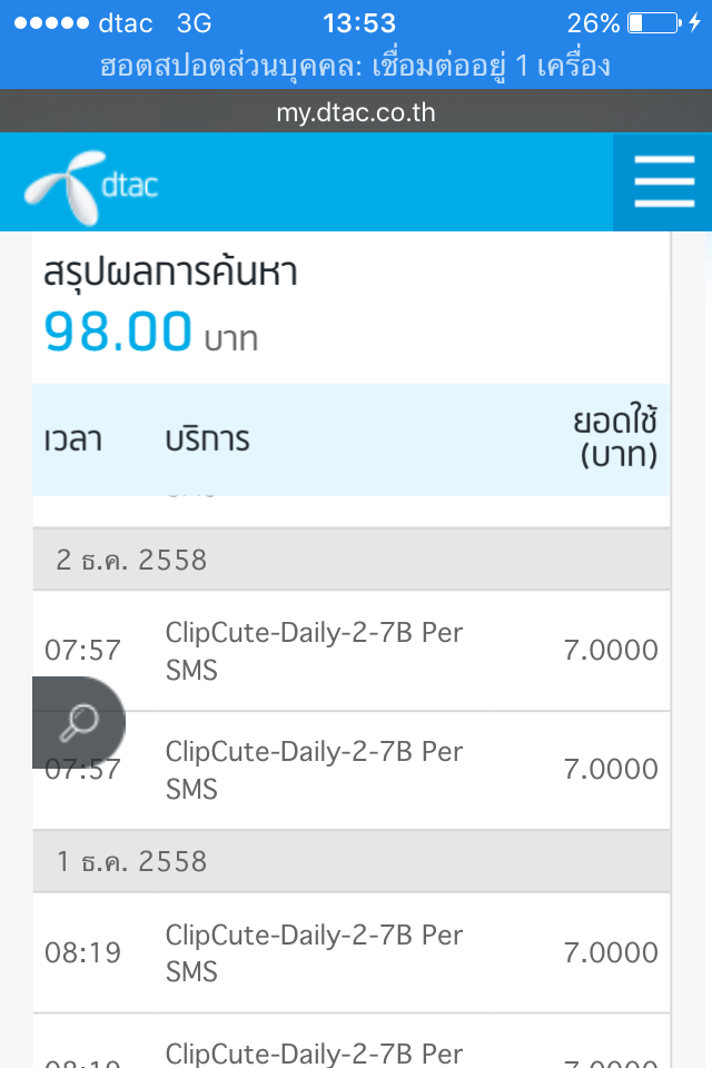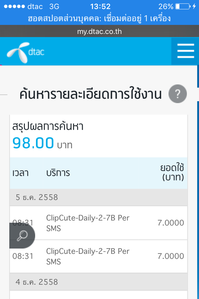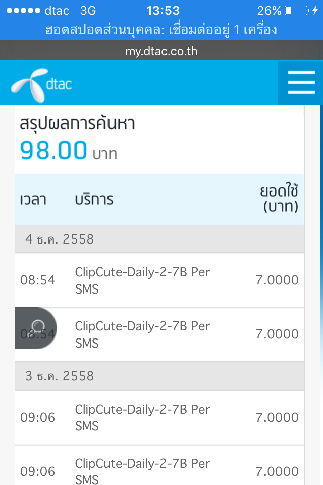 ดูข้อมูลการใช้งานใน my.dtac ปรากฏมีค่าใช้จ่ายจาก sms ของ clipcute-daly-2-7b per