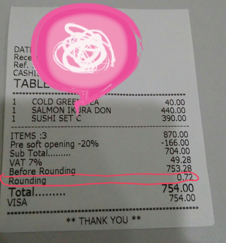 ว่าเป็นค่าอะไร พนักงานแจ้งว่าเป็นการปัดเศษสตางค์เพื่อให้สะดวกในการทอนเงิน แต่เนื่องจากเราชำระค่าอาหาร และค่าบริการด้วยบัตรเครดิต