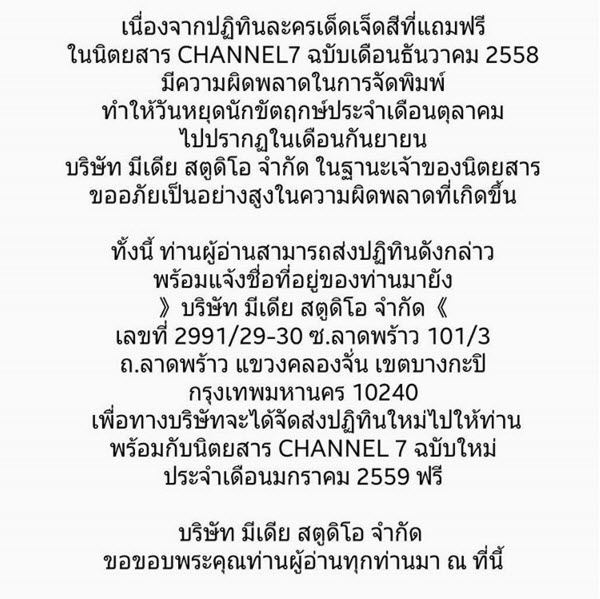 นิตยสาร CHANNEL7 ขออภัยและชี้แจงเรื่องปฎิทินผิดพลาด