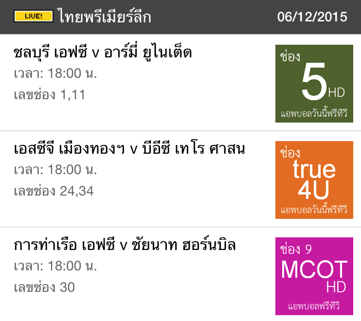 ฟุตบอลไทยพรีเมียร์ลีก วันนี้ (6/12/58) ฟรีทีวีถ่ายทอดสด