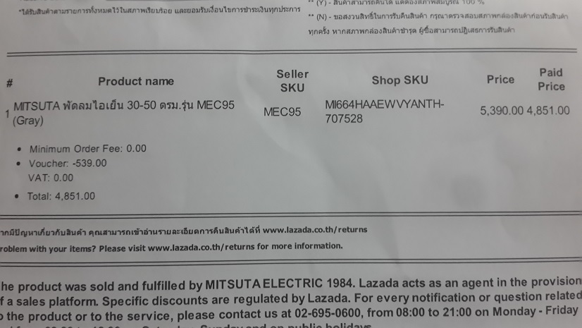 งานนี้ไม่ได้ว่า Lazada นะครับ เพราะเป็นเพียงสื่อกลางในการจำหน่าย แต่ว่าถึงผู้ผลิตเลยครับ สืบเนื่องมาจากวันที่ 30 พฤศจิกายน 2558 ผมได้ทำการสั่งซื้อพัดลมไอเย็นยี่ห้อ MITSUTA ในเว็บของ Lazada ซึ่งมีโปรโมชั่นลดราคาเหลือ 5,390 บาท จากราคาเต็มตามร้านต่าง ๆ 5,590 บาท และสามารถใช้บัตรเครดิตลดได้อีก เหลือราคาสุดท้ายประมาณ 4,851 บาท รวมกับผู้จำหน่ายสินค้าตัวนี้ คือ ผู้ผลิตเอง " Mitsuta " เลยตัดสินใจสั่งสินค้าดังกล่าว