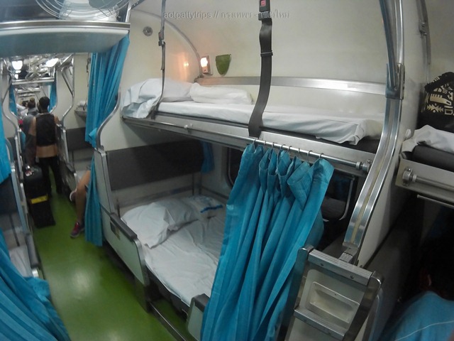 ตอนแรกนะมันจะเป้นเก้าอี้นั่งแต่ประมาน 2 ทุ่ม เจ้าหน้าที่รถไฟจะมาปูที่นอนให้ แล้วก็เวลาสัก 6-7 โมงเช้า เจ้าหน้าที่จะมาเก็บที่นอนแล้วปรับเป็นเก้าอี้ให้เหมือนเดิม