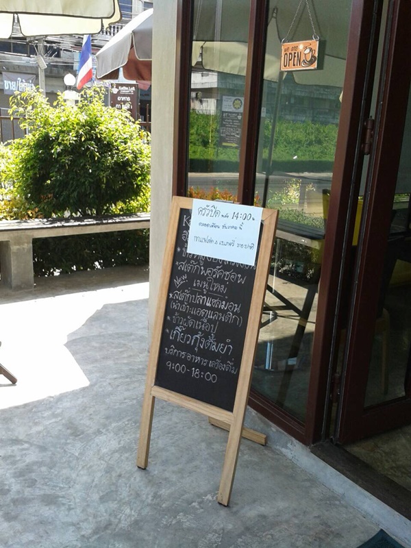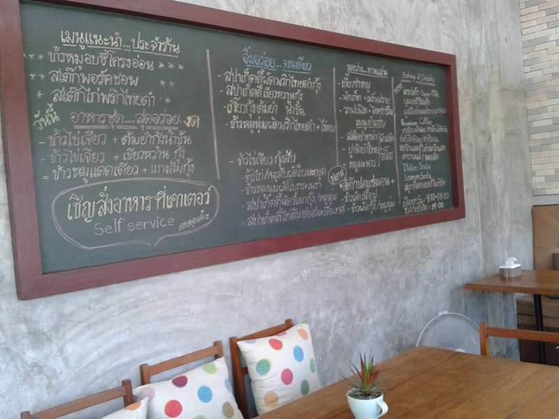 เข้ามาข้างในแล้ว ก็จะเจอกระดานใหญ่ๆ เขียนเมนูไว้ มีทั้งเครื่องดื่ม เค้ก อาหารจานเดียว เลือกได้แล้วก็ไปสั่งที่เคาน์เตอร์จ้ะ