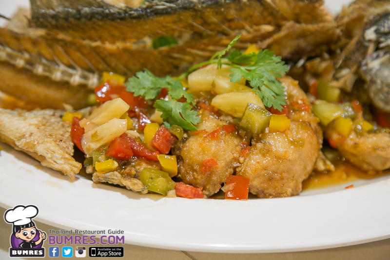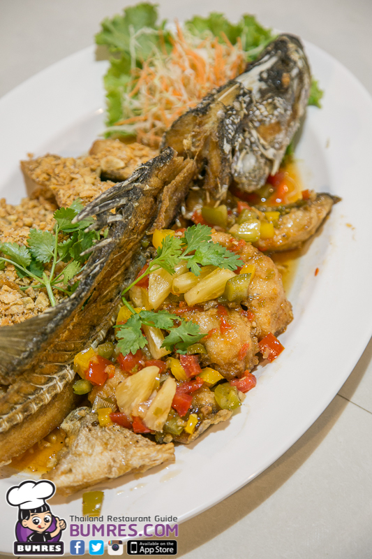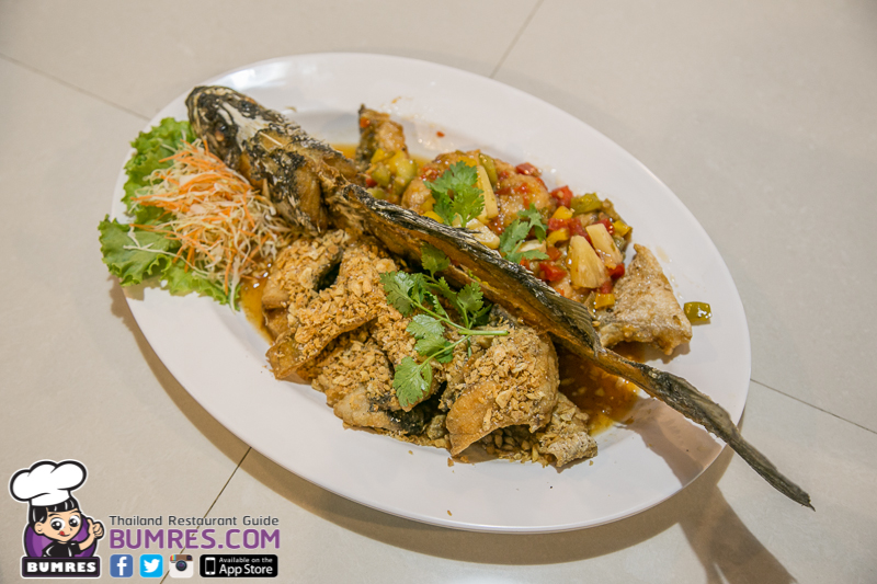 เมนูนี้จะแล่เนื้อปลากะพงออกมาเป็นชิ้น ๆ แล้วนำไปคลุกกับแป้งแล้วนำไปทอด แล้วจึงนำมาปรุงเป็น 2 แบบ คือ ทอดกระเทียม และผัดเปรี้ยวหวาน ผมว่ารสชาติดีทั้งคู่นะ