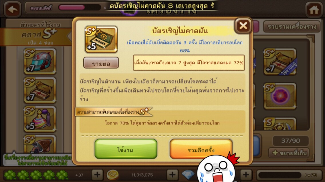 ใช้กล้วย 20 แลกแบบแปลนมา ก็เอามาบวก s7 กว่าจะติดขนาดใส่จี้โอกาส 70% ต้องใส่ไปถึง 10 -15 อัน กว่าจะติดถึง 7 พอถึงบวก s+ เหอๆ ไม่ต้องพูดถึง ใส่ จี้ s โอกาส 70% ผลเหมือนเดิม 10 กว่าจี้ถึงติดครบ กว่าจะล่