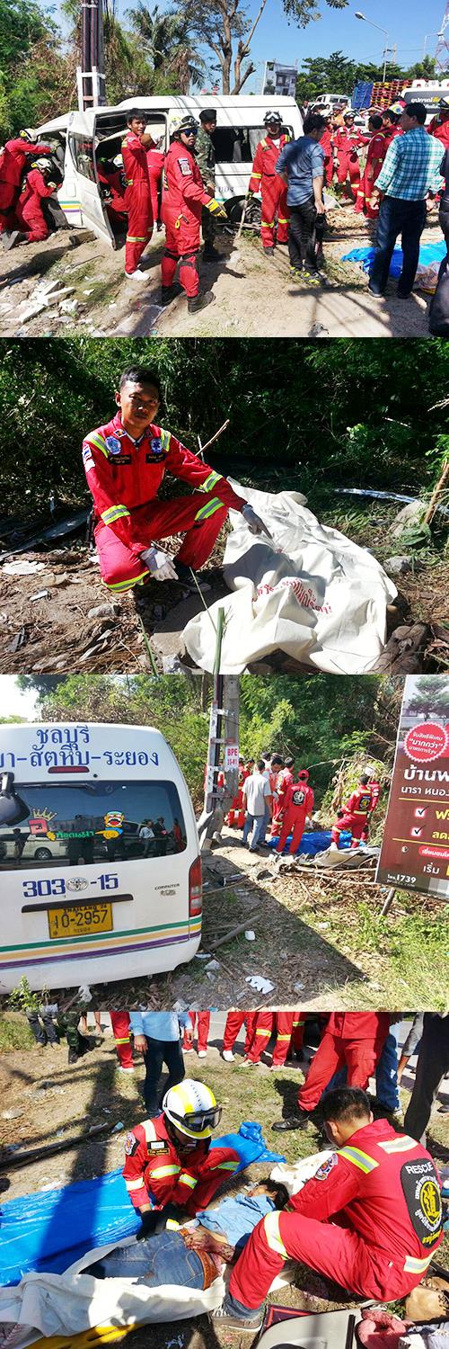 ในที่เกิดเหตุพบรถตู้โดยสารประจำทางสายชลบุรี พัทยา สัตหีบ ระยอง ของบริษัทสุขุมวิทเดินรถ จำกัด เสียหลักตกข้างทาง ด้านหน้ารถชนเข้ากับเสาไฟฟ้าพังยับเยิน ภายในรถพบคนขับเป็นผู้ชายเสียชีวิตคาที่ติดอยู่บริเวณที่นั่งคนขับ ทราบชื่อคือ นายไกรสร วรสาร อายุ 31 ปี อยู่บ้านเลขที่ 53 หมู่ 7 ต.ปราสาทเยอ อ.ไพรบึง จ.ศรีสะเกษ และมีเด็กรถที่นั่งอยู่ด้านหน้าคู่กับคนขับกระเด็นออกมาเสียชีวิตอีก 1 ราย ทราบชื่อคือ นายเอก ไม่ทราบชื่อนามสกุลจริง