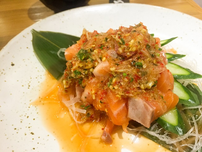 มิโซะแซลม่อนโรล ของขึ้นชื่อของร้านเลยนะ พนักงานบอก