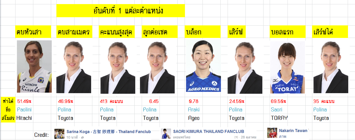 ย้อนหลังลีคญี่ปุ่น 13/12/2558 TORAY Vs toyota TORAY : ซาโอริ ซาโกดะ ทาคาดะ Dixon(MB เมกา) toyota : ฟูจิตะ Polina (สูง 198cm คะเเนนสูงสุดลีคญี่ปุ่น) https://www.youtube.com/watch?v=lJvPCjPOWPU