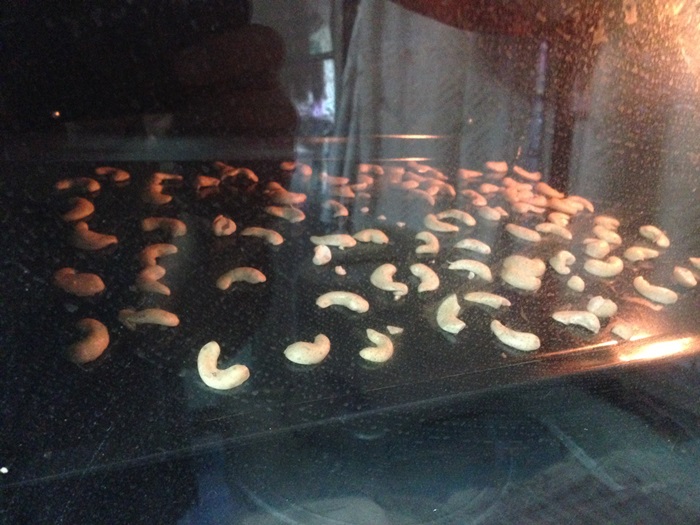 - นำเม็ดมะม่วงหิมพานต์ที่จะเอาไว้แต่งหน้าไปอบ ผมใช้ไฟ 130 อบประมาณ 5 นาที หรือดูเอาให้มันพอสุกเหลืองๆอะครับ