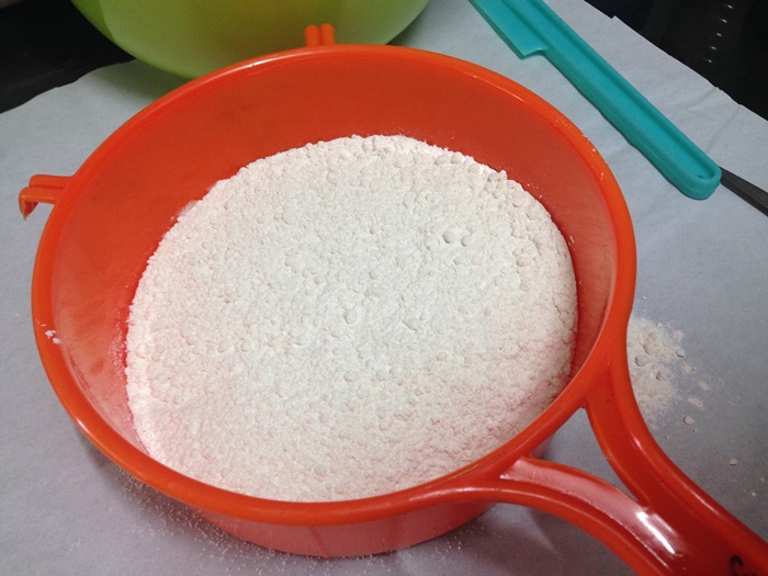 - ร่อนแป้ง ผงฟู เกลือ เข้าด้วยกัน