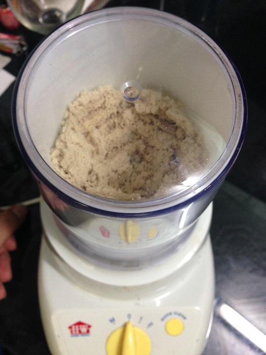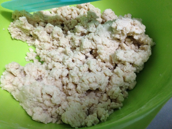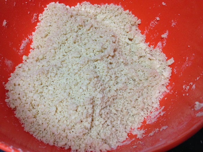 - ตีส่วนผสมให้เข้ากัน ตีด้วยความเร็มต่ำ สังเกตุให้ส่วนผสมเป็นเม็ดทราย